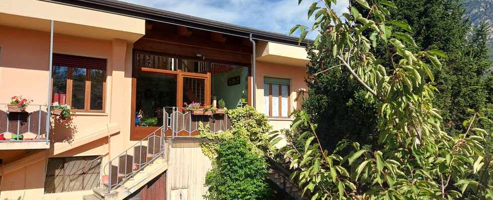 Terrazzo con vista sulle montagne, Tavolo e sdraio, Tenda parasole, Cortile interno chiuso per parcheggiare